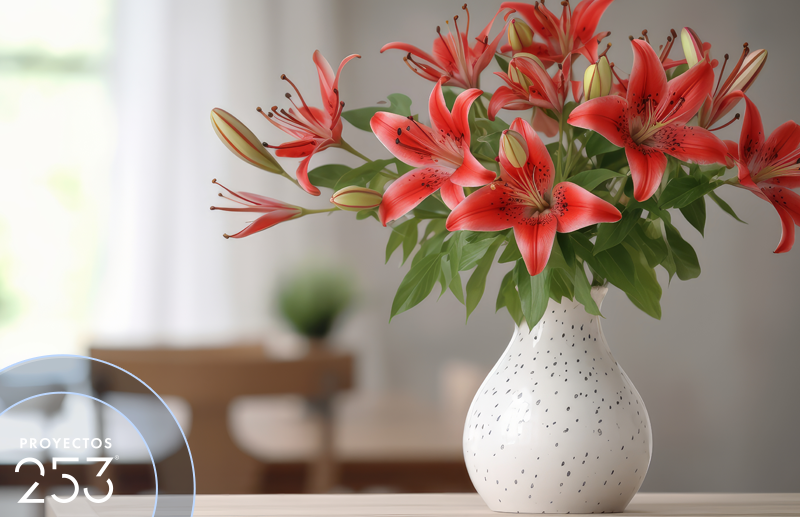 Lilies are flowers that convey harmony and delicacy. They are perfect for use as centerpieces in living rooms or dining rooms, as their height adds presence and elegance to the decor. Placing the arrangement in a glass vase can help reinforce that feeling of lightness and sophistication.